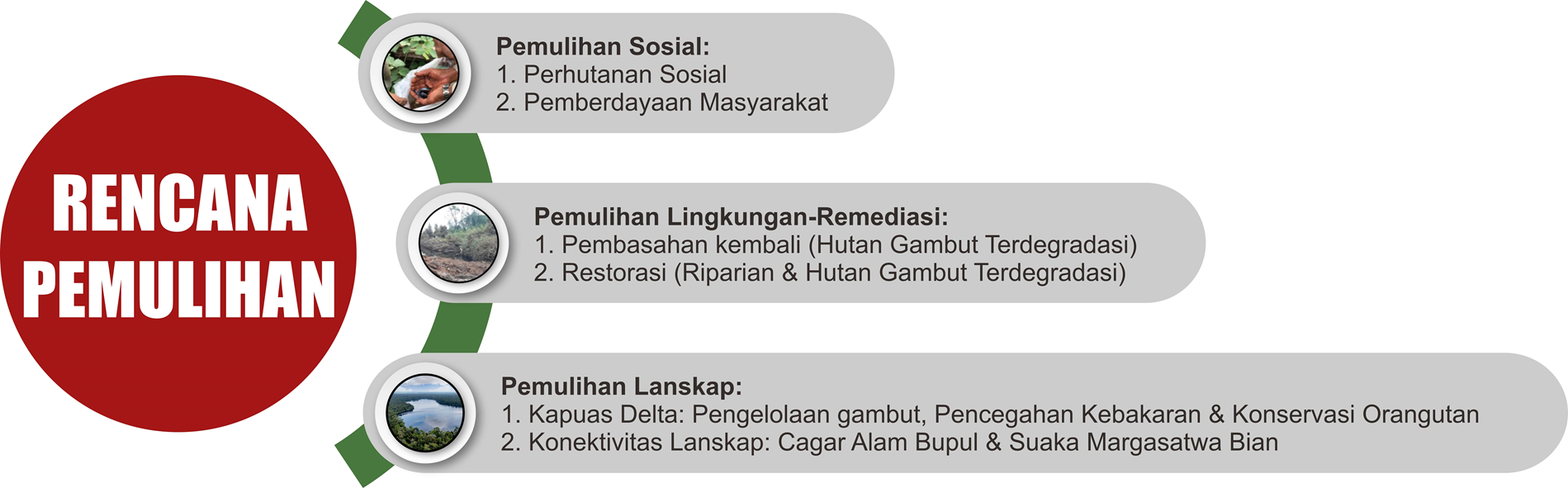 Berdasarkan analisis komprehensif, kami telah mengembangkan rencana pemulihan jangka panjang yang mencakup tiga pilar yaitu: Sosial, Lingkungan, dan Bentang Alam untuk diimplementasikan di area tanggung jawab restorasi seluas 11.900 hektar.